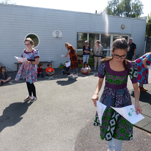 Habillées de robes confectionnées dans de jolis tissus africains, les étudiantes, ont aussi distribué les questionnaires croisés sur nos modes de vie respectifs : moment d'échanges et de partage.